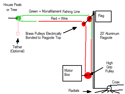 The sketch below indicates a "clothesline" configuration where a movable wire element and a monofilament support element are used to put the proper length of flattop wire in place for an Inverted "L." The remaining wire runs down the outside of the Flagpole, over a drive pulley and attaches to the monofilament to continue back to the top of the Flagpole, then out to the "turn-around" pulley and attaches to the wire.