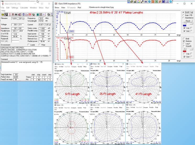 28.5MHz Multi-Low Vswr lengths were evaluated with both 4Nec2 and Nec2Go modeling software. The results below indicated that both modeling engines were in agreement.