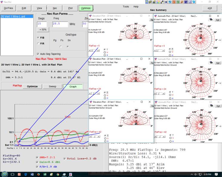 The performance models for 28.5MHz where the antenna exhibits Az/El Pattern Gain as a function of lengths.