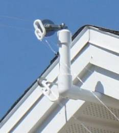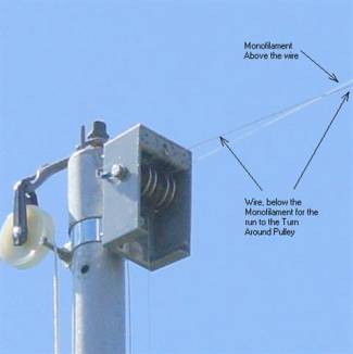 The wire and the monofilament exit the box in the same horizontal plane. The weight of the wire causes the wire to droop below the monofilament thus preventing tangling. In the vertical plane, the lines drop parallel to the mast and they are separated by ferrules (sleeves) located midway down the mast. Tension keeps these lines apart, thus tangling has not been an issue. Normally a cover is used, but these photos were taken for explanation only.