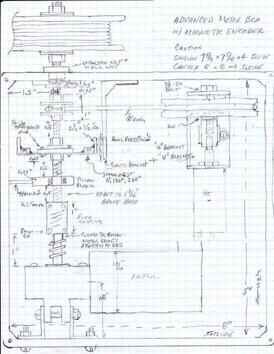 The choice was made to use a low resolution magnetic encoder where the magnets are mounted to a disk which is centered on the main power shaft of the Motor Box. Thus, there isn't any lost motion in the readout, merely the low resolution penalty which is about 3" of flattop wire position uncertainty. Pot readout is supported for diagnostics.