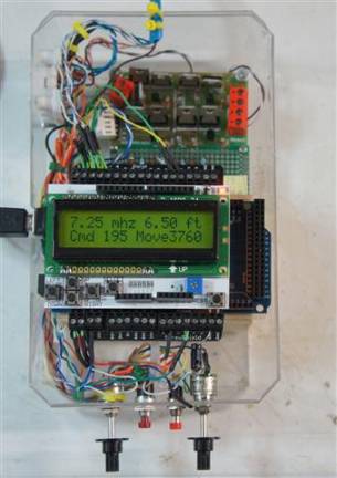 A drawback of the "Simple" control box is that Increase/Decrease command is only a switch closure and the motor is "plugged". Thus, wire motion start and stops abruptly and that induces an impulsive motion profile. Micro-controller technology presents the opportunity to control the motions of the antenna wire in a precise way as well as set wire length based on Frequency using a single (pot or encoder) dial with only ham bands in its look-up table.