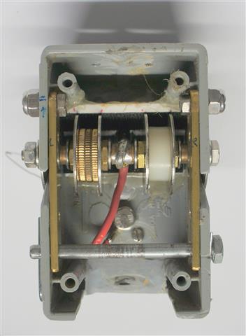 The completed assembly ready to mount to the mast. Wire is threaded from the Hi Grip drive pulley, up through the brass pulley. Out toward the turnaround pulley to meet the insulating fiber line. Over the turnaround pulley. Back to the top of the nylon pulley. Down the backside of the nylon pulley and down toward the Hi Grip drive pulley.