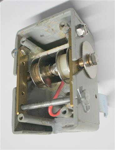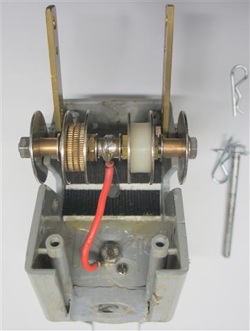 The completed assembly ready to mount to the mast. Wire is threaded from the Hi Grip drive pulley, up through the brass pulley. Out toward the turnaround pulley to meet the insulating fiber line. Over the turnaround pulley. Back to the top of the nylon pulley. Down the backside of the nylon pulley and down toward the Hi Grip drive pulley.